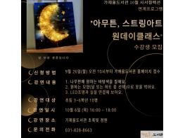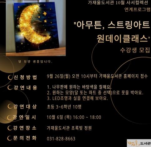 의정부시 가재울도서관은 10월 6일 목요일 오후 4시부터 6시까지 초등3~6학년 어린이 10명을 대상으로 하는 사서컬렉션 연계프로그램 ‘아무튼, 스트링아트 원데이클래스’를 운영한다.