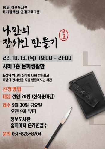 10월 13일(목) 오후 7시부터 『나만의 장서인 만들기』를 주제로 도장의 역사와 전각에 대해 알아보고 나만의 장서인을 직접 만들어 보는 프로그램을 진행할 예정이다.