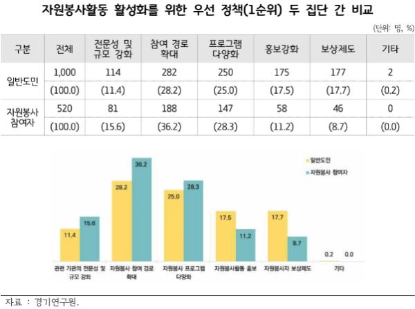 2022년 7월 6일~7일 경기도민 1,000명과 2022년 7월 4일~11일 경기도 자원봉사활동에 참여해 본 경험이 있는 참여자 520명 대상으로 자원봉사활동에 대한 인식조사 결과, 도민 28.2%, 자원봉사참여자 36.2%가 자원봉사 참여 경로 확대를 꼽았으며, 도민 25%, 자원봉사참여자 28.3%가 자원봉사 프로그램 다양성 강화가 필요하다고 응답했다.