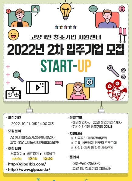 고양특례시 고양산업진흥원이 운영하는 고양 1인 창조기업 지원센터에서 2022년 2차 신규 입주기업을 모집한다.
