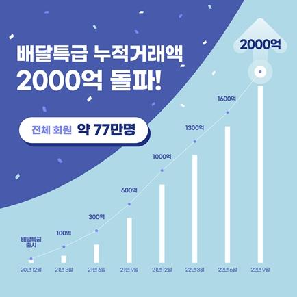 경기도주식회사는 지난 9월 25일 일요일 기준, 배달특급의 총 누적 거래액이 2,000억 원을 넘었다고 27일 밝혔다.