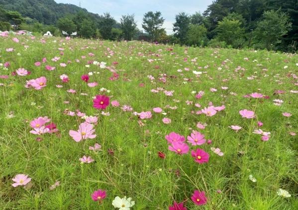 경기도는 ‘연인산 명품 계곡길’과 ‘소릿길’을 트레킹하는 탐방객들을 위해 연인산도립공원 탐방안내소 인근(가평읍 승안리 297-41번지 등)에 코스모스 정원 조성을 완료했다고 28일 밝혔다.