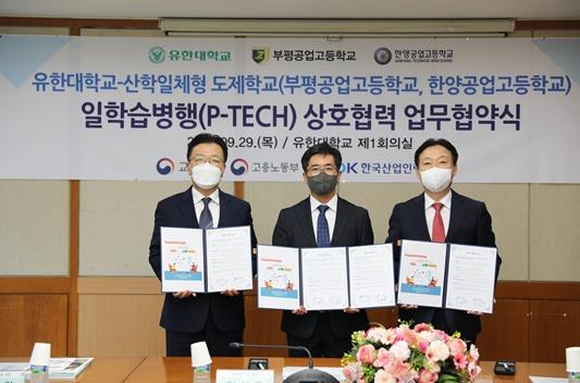 유한대학교(총장 김현중)는 고숙련 일학습병행(P-TECH)사업 활성화를 위해 29일 부평공업고등학교, 한양공업고등학교와 유재라관 2층 회의실에서 업무협약을 체결했다.