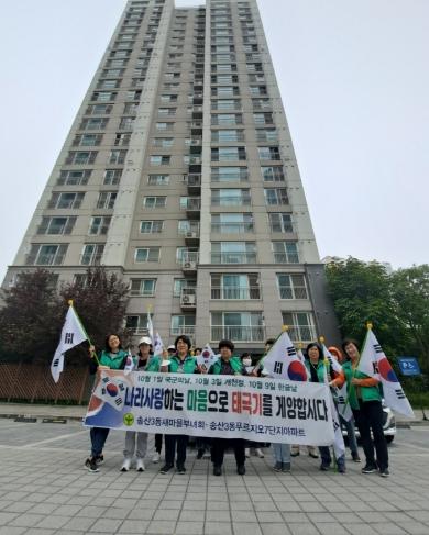 의정부시 송산3동행정복지센터 새마을부녀회는 9월 29일 관내 푸르지오7단지아파트에서 국군의 날, 개천절, 한글날을 맞아 주민들과 함께 ‘나라사랑 태극기 달기 운동’을 전개했다.