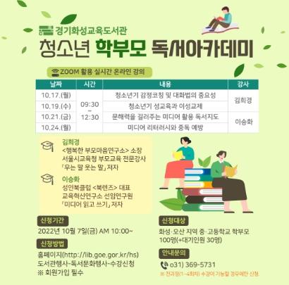 경기화성교육도서관(관장 이경희)이 화성·오산 지역 중고등학생 자녀를 둔 학부모를 대상으로 ‘청소년 학부모 독서 아카데미’를 운영한다.