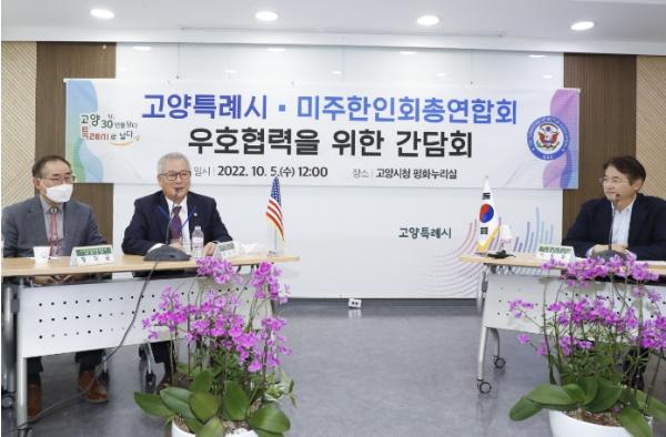 이동환 고양특례시장이 지난 5일 고양시청 평화누리실에서 모국을 방문한 미주한인회총연합회 회원 20여명과 간담회를 가지며 상호 협력하기로 했다.