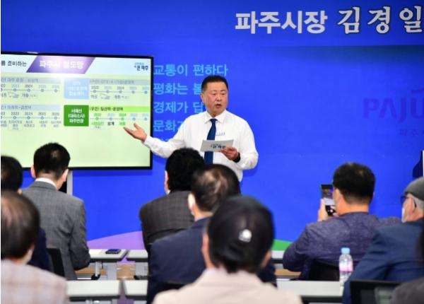 김경일 파주시장이 취임 100일을 맞아 6일 기자회견을 개최했다. 이날 오후 파주시청 대회의실에서 열린 기자회견에서 김 시장은 취임 후 100일 간의 소회와 성과를 소개하고 향후 임기 동안 중점적으로 추진할 사업 등 주요 시정계획을 제시했다.