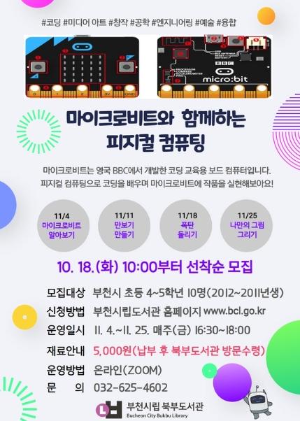 부천시 북부도서관에서 11월 중 ‘마이크로비트와 함께하는 피지컬 컴퓨팅’이라는 주제로 부천시 초등 4~5학년 10명을 대상으로 과학예술프로그램을 운영한다.