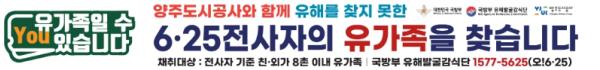 10월 6.25 전사자 유가족 집중찾기의 달을 맞아 공사에서 관리하는 현수막지정게시대를 활용하여 6.25 전사자 유가족 찾기 현수막을 게시하는 것으로 10월 한 달간 홍보할 예정이다.