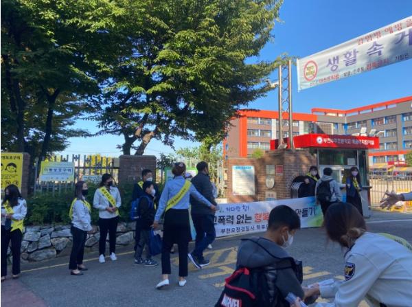 부천수주초등학교는 10월 13일(목) 수주초 교문 앞에서 등굣길 교통지도와 함께 학교폭력예방 및 근절을 위한 캠페인을 진행했다. 수주초 어머니폴리스 임원들과 학교 전담 경찰관 및 교직원들이 참여한 가운데 홍보 전단과 홍보물품을 배부하며 학교폭력 근절과 안전한 학교 만들기에 동참해 줄 것을 당부했다.