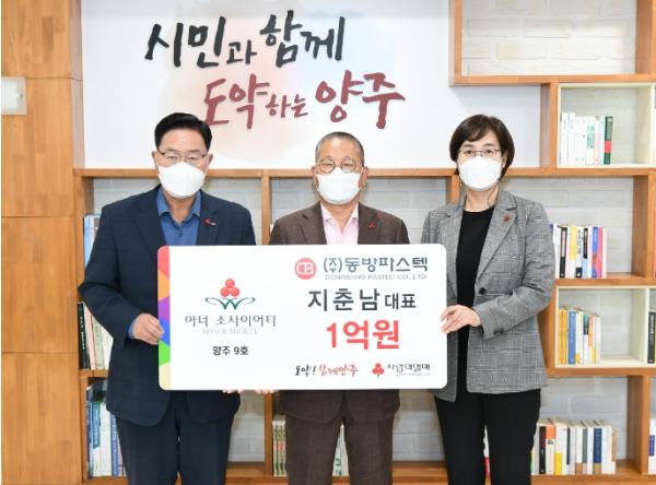 양주시는 지춘남 ㈜동방파스텍 대표가‘양주시 아너소사이어티 9호 회원’과 ‘양주시 나눔명문기업 1호’에 동시 가입했다고 13일 밝혔다.