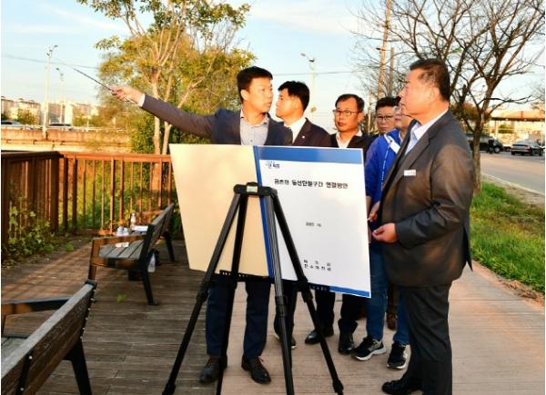 이날 방문한 현장은 금촌 배수펌프장 맞은편 순달교 앞에서 금촌교, 신금촌교를 지나 공릉천까지 이어지는 구간으로, 해당 구간을 산책하기 위해서는 금촌천에서 도로로 올라와 왕복 6차선도로와 8차선도로를 수차례 건너야 하는 불편한 실정으로 그간 주민들은 지속적으로 동선 연결을 건의해왔다.