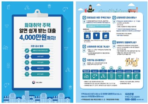 화재예방, 감지, 소화(소방)에 필요한 공사를 진행할 경우 세대(호) 당 최대 4천만원, 연이율 1.2%(5년 거치, 10년 상환) 대출이 가능하다.