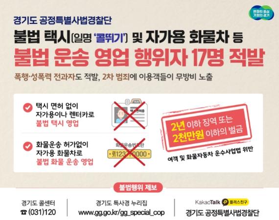 자가용이나 렌터카를 이용해 불법으로 택시영업, 일명 ‘콜뛰기’를 한 일당과 허가 없이 자가용 화물차로 운송을 하고 돈을 받은 화물차주 등 17명이 경기도 수사망에 덜미를 잡혔다. 이들 중에는 강력범죄 전과자인 기사도 있어 이용자들에 대한 2차 범죄도 우려된다.
