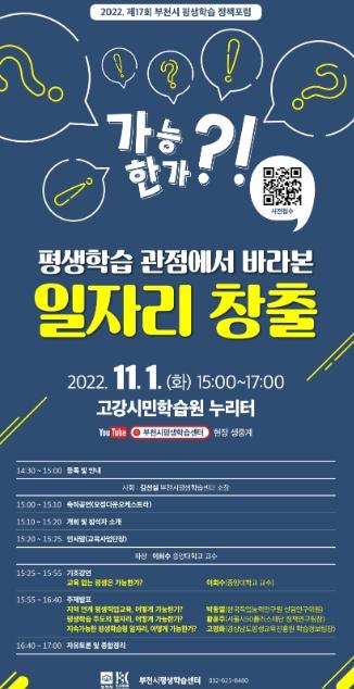 부천시는 오는 11월 1일 오후 3시 ‘평생학습 관점에서 바라본 일자리 창출’이라는 주제로 ‘제17회 부천시 평생학습 정책포럼’을 개최, 참여자를 모집한다.
