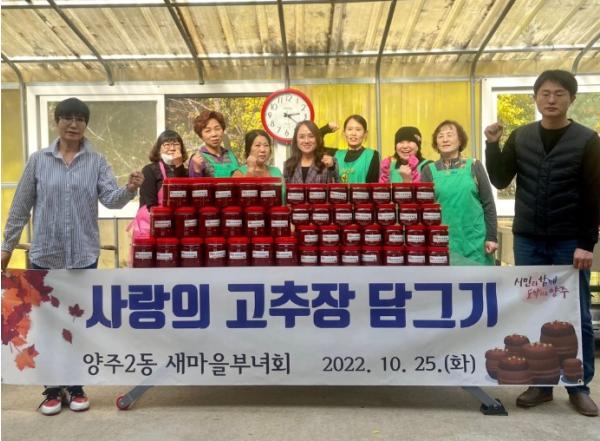 양주시 양주2동 새마을 부녀회(회장 한순옥)는 지난 25일 두레농원에서 ‘사랑의 고추장 담그기’ 행사를 개최했다고 밝혔다.