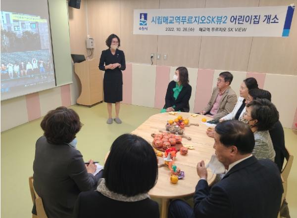 이날 간담회에는 수원시 다함께돌봄센터 14·15호점 센터장, 시립푸르지오SK뷰1·2 어린이집 원장, 수원시 복지여성국장, 수원시의회·경기도의회 의원, 수탁기관 대표자, 매교역푸르지오SK뷰 관리소 관계자 등이 참석했다.