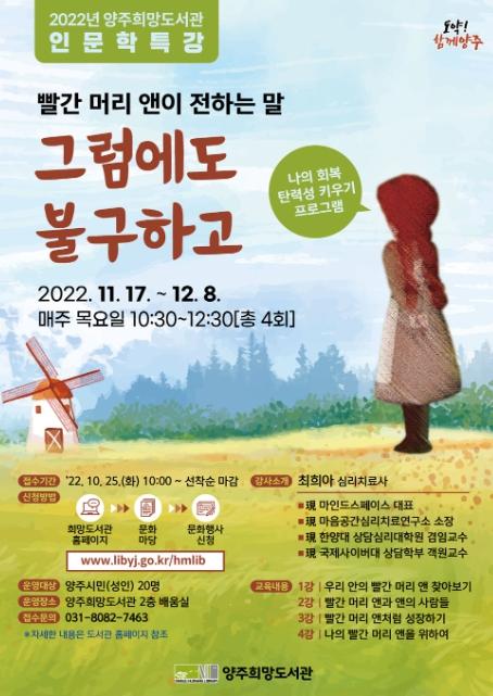 양주희망도서관은 오는 11월 17일부터 12월 8일까지 ‘빨간 머리 앤이 전하는 말-그럼에도 불구하고’심리 인문학 특강을 운영한다.