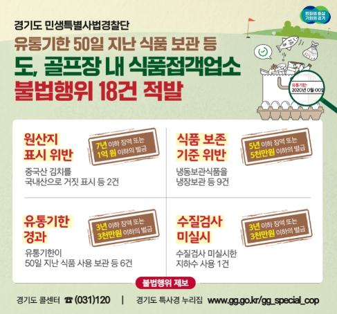 경기도 민생특별사법경찰단은 지난 10월 4일부터 14일까지 안성과 용인, 여주 등 도내 8개 시군 82개 골프장 내 식품접객업소 118곳을 단속한 결과 식품위생법, 원산지표시법을 위반한 17개 업소(18건)를 적발했다고 31일 밝혔다.