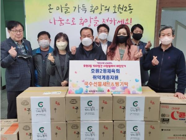 의정부시 호원2동행정복지센터 복지지원과는 11월 3일 호원2동 체육회(회장 박성원)에서 호원2동 취약계층을 위한 국수선물세트 90개와 빵 300개를 기탁했다고 밝혔다.