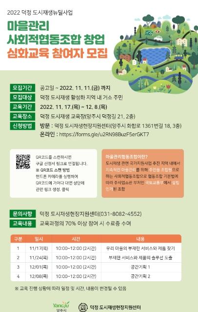 양주시는 오는 11일까지 덕정 도시재생현장지원센터에서‘덕정 마을관리사회적협동조합 창업 심화과정’에 참여할 지역주민을 모집한다고 밝혔다.