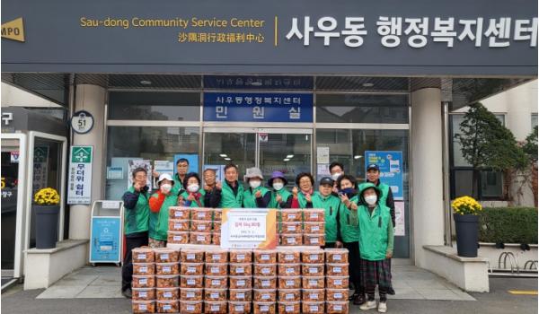 사우동 새마을남녀지도자협의회 지난 3일 사우동행정복지센터에서 홀몸 어르신 및 돌봄 가정 등 지역 내 어려운 이웃을 위한 ‘사랑의 김치 나눔 행사’를 실시하고, 관내 저소득층 80가구에 김치를 전달했다.