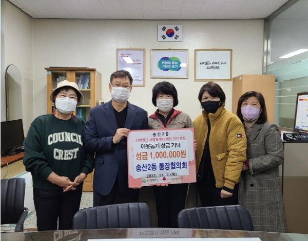 의정부시 송산2동주민센터는 11월 3일 송산2동 통장협의회가 사랑릴레이 배턴 잇기 운동의 성황을 기원하며 성금 100만 원을 기탁했다고 밝혔다.