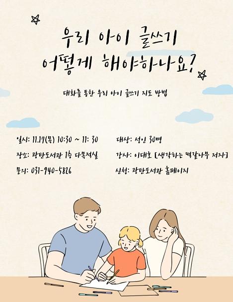 파주시 광탄도서관은 오는 17일 광탄도서관 1층 다목적실에서 이대호의 작가의 ‘우리 아이 글쓰기 어떻게 해야 하나요?’ 강연을 진행한다.