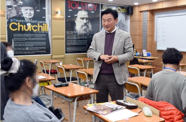 김동근 의정부시장은 11월 7일 의정부시 가능동 소재 초·중등 학력인정 문자해득교육기관인 노성야간학교를 방문해 교육현장을 점검하고 시설 운영의 애로사항을 세밀하게 살폈다.