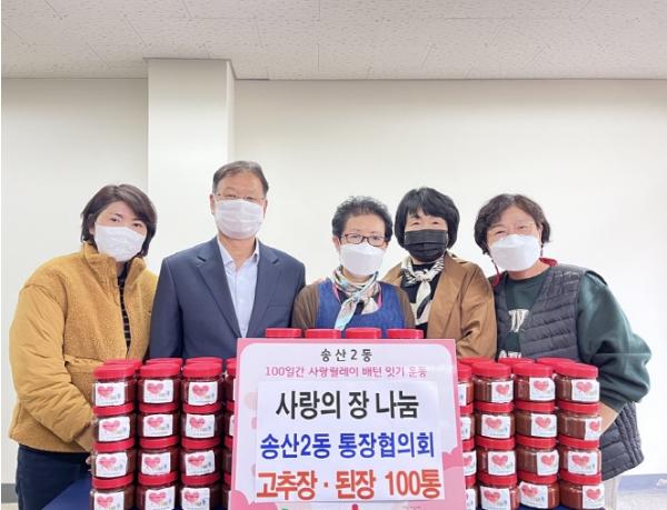 의정부시 송산2동주민센터는 11월 7일 100일간 사랑릴레이 배턴잇기에 동참해 취약계층을 위해 된장, 고추장 각 50통(500g)을 기탁했다고 밝혔다.