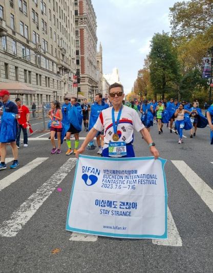 신동훈 부천시 전 공무원이 뉴욕마라톤대회에 참가, 부천국제판타스틱영화제(BIFAN, 집행위원장 신철)를 알려 화제다. 신동훈(64) 씨는 지난 6일 미국 뉴욕에서 열린 뉴욕마라톤대회 풀코스(42.195km)를 완주한 뒤 BIFAN 현수막을 들고 기념 촬영, 전 세계에 BIFAN을 알렸다.