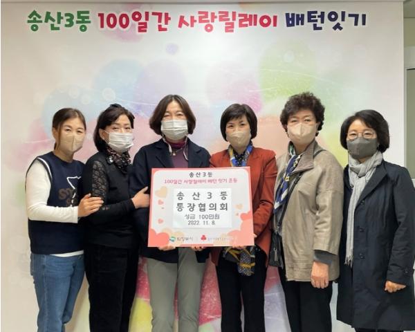 의정부시 송산3동행정복지센터는 11월 8일 송산3동 통장협의회에서 ‘송산3동 100일간 사랑릴레이 배턴잇기’에 성금 100만 원을 기탁했다고 밝혔다.
