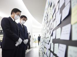 김 지사는 염종현 의장과 합동분향소 한쪽 벽면에 빽빽하게 붙여진 추모 포스트잇을 바라다보다가 합동분향소 제단에 놓인 20대 희생자 2명의 영정사진을 소개했다. 도는 유가족의 요청에 따라 한 희생자는 지난 7일부터, 다른 희생자는 9일부터 합동분향소에 영정사진을 안치했다.