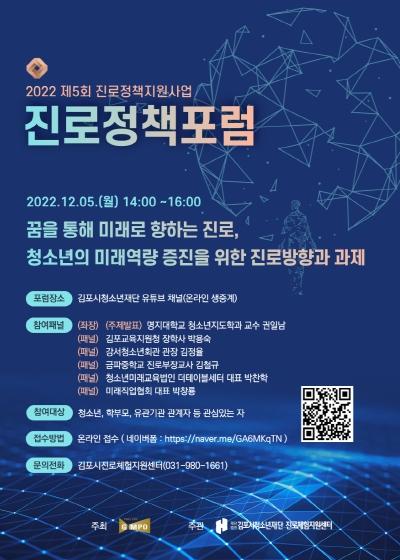 (재)김포시청소년재단 진로체험지원센터는 ‘청소년의 미래역량 증진을 위한 진로방향과 과제’를 주제로 오는 12월 5일 14시부터 비대면으로 진로정책포럼을 개최한다.