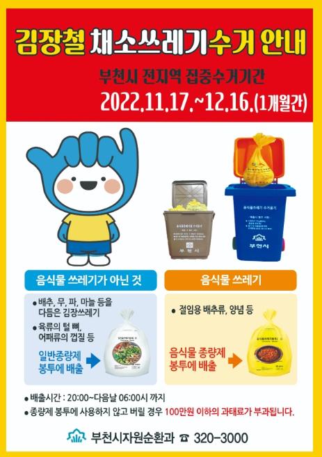 부천시는 11월 17일부터 12월 16일까지 김장철 채소 쓰레기 집중 수거 기간을 운영하고 올바른 배출 방법을 함께 홍보한다.