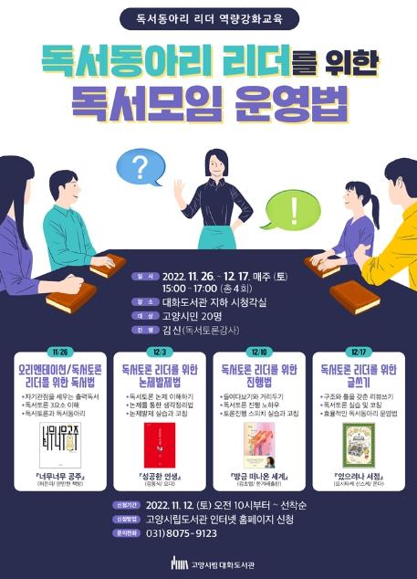고양특례시 대화도서관이 11월 26일부터 12월 17일까지 독서동아리 리더 양성 프로그램 '독서동아리 리더를 위한 책모임 운영하는 법'을 운영한다.