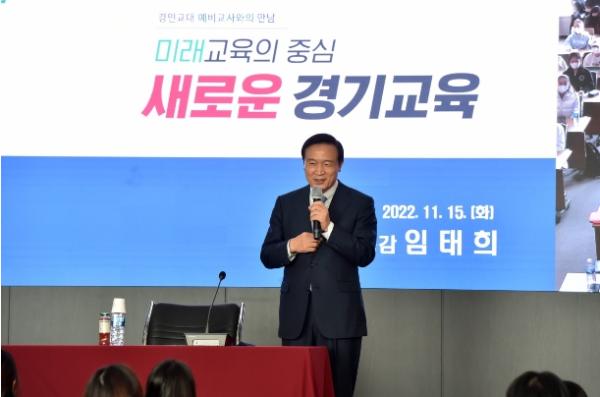 임태희 교육감이 15일 경인교육대학교 경기캠퍼스에서 예비교사들과 만남의 자리를 갖고 ‘경기 미래교육의 방향’을 주제로 특강을 했다.