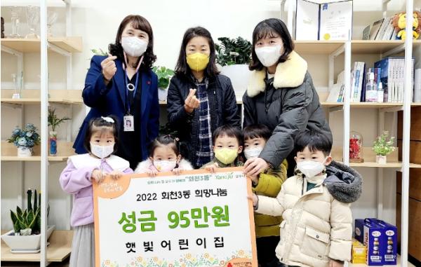 양주시 회천3동 행정복지센터는 지난 15일 고암동에 소재한 햇빛어린이집에서 어려운 이웃을 위해 써달라며 이웃돕기 성금 95만원을 기탁했다고 밝혔다.