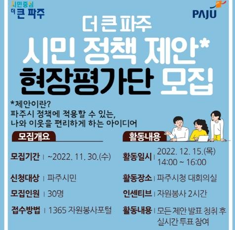 파주시는 ‘더 큰 파주 시민 정책 제안 공모전’의 본심사가 12월 15일에 개최됨에 따라 자원봉사자 형태의 현장 평가단 30명을 모집한다고 밝혔다.