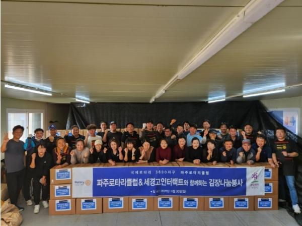 이날 전달된 김치는 파주로터리클럽과 세경고등학교 학생들이 마련한 김치로, 이들은 파주읍 지역 내 저소득 취약계층을 위해 20일 김장 봉사를 진행했다.