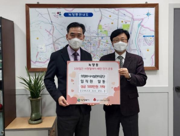의정부시 녹양동주민센터는 11월 21일 의정부시시설관리공단 임직원 일동이 사업장 소재지인 관내 저소득 취약 계층에게 사용해 달라며 성금 500만 원을 기탁했다고 밝혔다.
