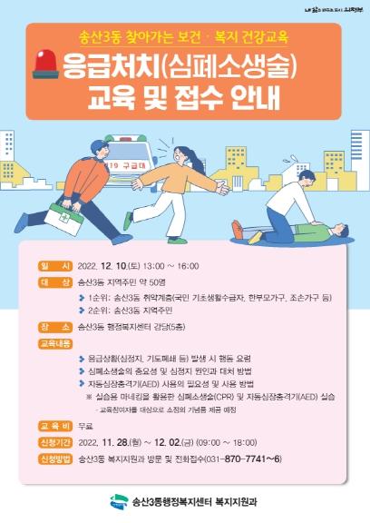 의정부시 송산3동 복지지원과는 응급상황 대처를 위한 응급처치(심폐소생술) 교육 참가자를 11월 28일(월)부터 12월2일까지 취약계층 위주 선착순으로 모집한다고 밝혔다.
