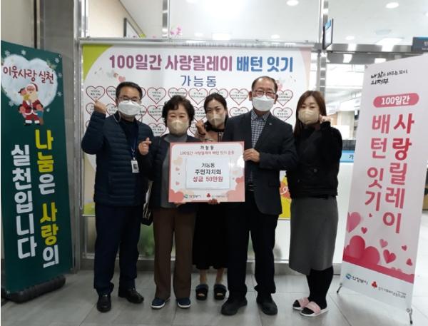 의정부시 가능동주민센터는 11월 23일 가능동 주민자치회가 100일간 사랑릴레이 배턴 잇기 운동에 이웃돕기 성금 50만 원을 기탁했다고 밝혔다.