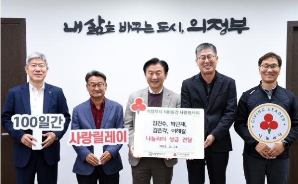 의정부시는 11월 24일 김진수(㈜네트컴시스템 대표이사), 박근재(강솔건설중기 대표이사), 김은각(㈜세웅건설 대표이사), 이해길(우영산업 대표이사)이 의정부시 저소득층 지원을 위한 성금 각 100만 원을 기부하며 의정부시 나눔리더 31호(김진수), 32호(박근재), 33호(김은각), 34호(이해길)로 가입하게 됐다고 밝혔다.