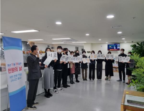 의정부시 송산3동은 11월 24일 올바른 민원 문화를 조성하기 위해 올해 처음 지정된 ‘민원의 날’을 기념해 송산3동 공공복합청사 민원실에서 ‘제1회 민원의 날’ 캠페인을 실시했다.