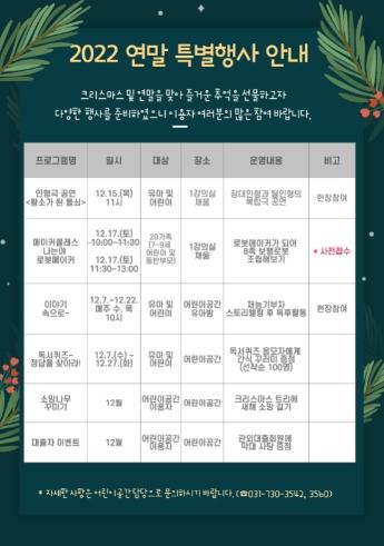 경기성남교육도서관(관장 전성룡)은 12월 1일부터 31일까지 유아와 어린이를 대상으로 연말 특별행사를 운영한다.