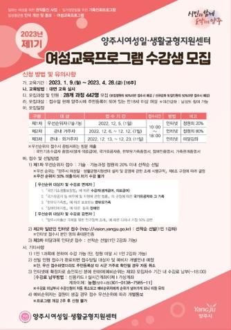 양주시 여성일·생활균형지원센터는 오는 12월 5일부터 23일까지 2023년 제1기 여성교육프로그램 수강생을 모집한다.