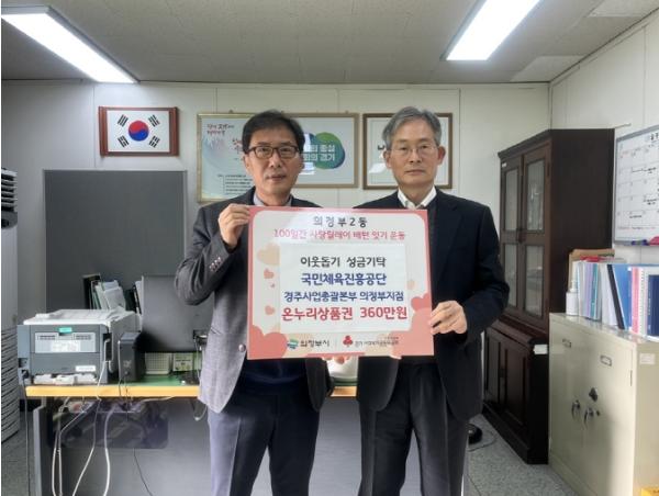 의정부시 의정부2동주민센터는 12월 7일 국민체육진흥공단 경주사업총괄본부 의정부지점이 100일간 사랑릴레이에 동참하기 위해 온누리상품권 360만 원을 기탁했다고 밝혔다.