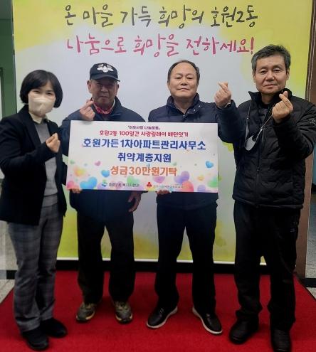 의정부시 호원2동행정복지센터 복지지원과는 12월 7일 호원가든1차아파트 입주민 일동이 성금 30만 원을 전달하며 100일간 사랑릴레이 배턴 잇기운동에 동참했다고 밝혔다.