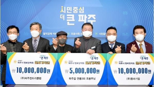 (재)파주시행복장학회는 19일 ㈜동마기업과 ㈜파주컨트리클럽에서 각 천만원, 조용무 어르신(▲파주읍연풍3리, 82세)으로부터 5백만원을 기탁받았다. 특히 조용무 어르신은 파주에서 농사지으며 오랫동안 아껴 모은 금액을 기부해 의의가 크다.